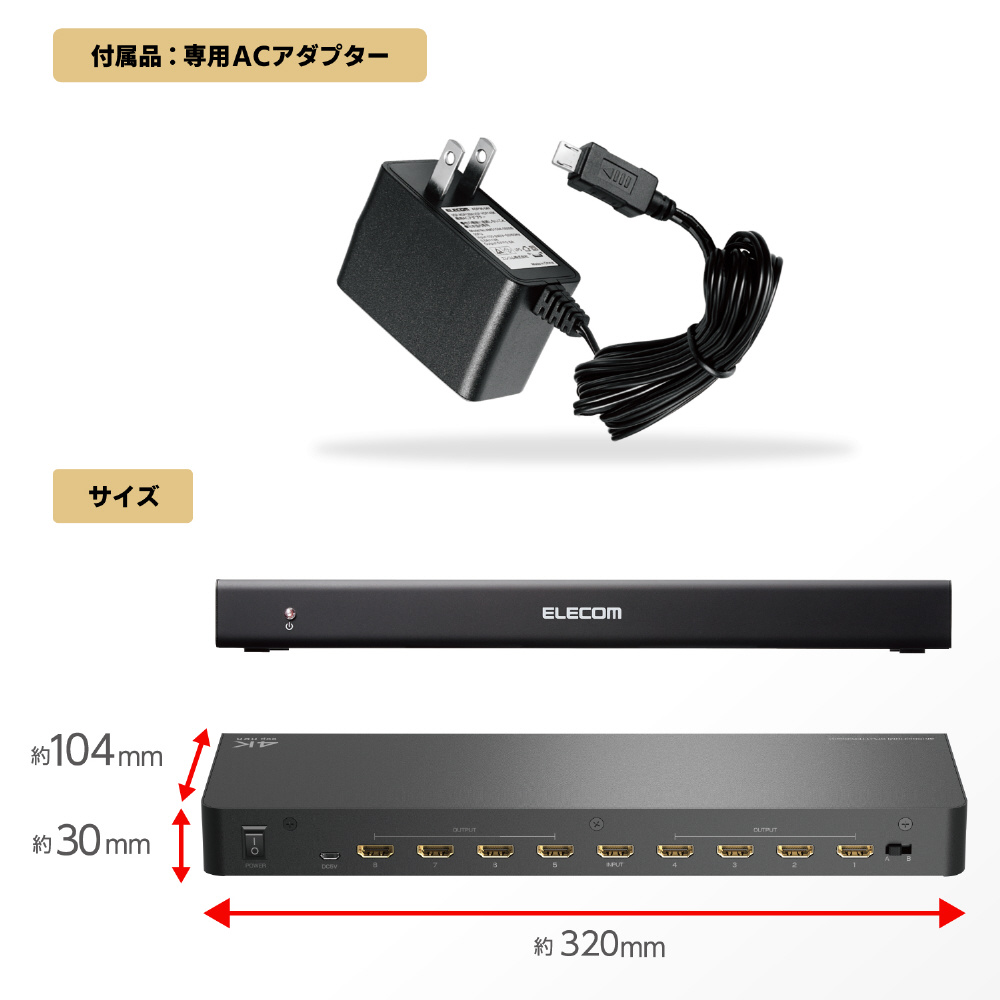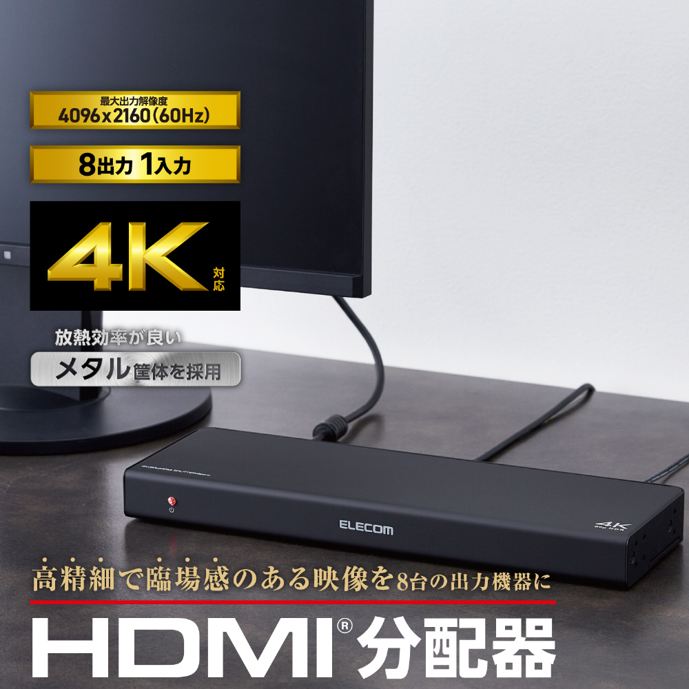 4K60Hz(18Gbps)、HDCP2.2対応により、高精細で臨場感のある映像を8台のディスプレイやプロジェクターなどの映像機器に分配できます。専用ACアダプターを付属し安定した動作を実現、また放熱効率が良いメタル筐体を採用しています。