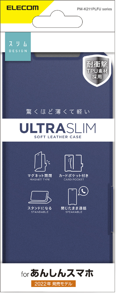 | 商品名 | あんしんスマホ(KY-51B)/レザーケース/手帳型/UltraSlim/薄型/磁石付き/ネイビー PM-K211PLFUNV |