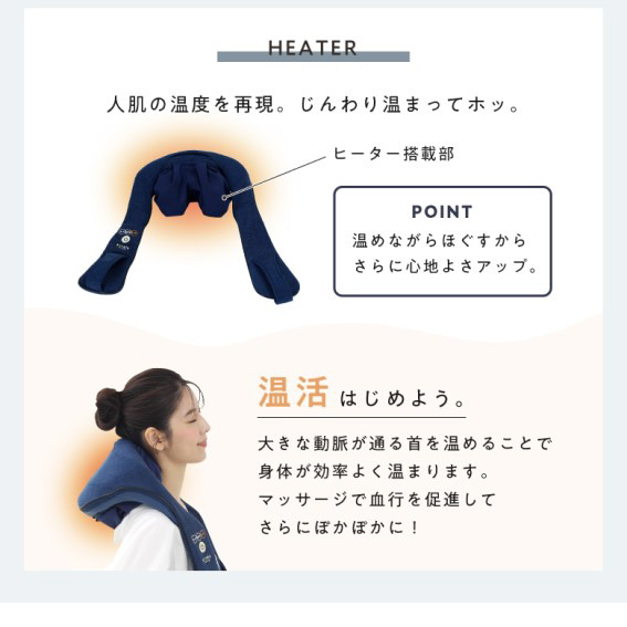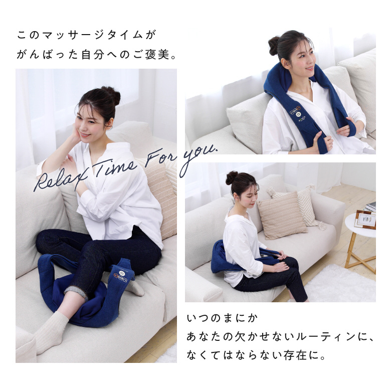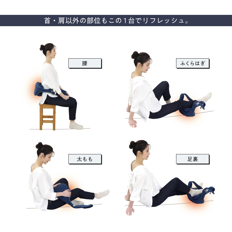 首以外にも、腰、太もも、ふくらはぎ、足裏等、身体の色んな部分に使えるので、これ1台で幅広い部位のマッサージが可能です。