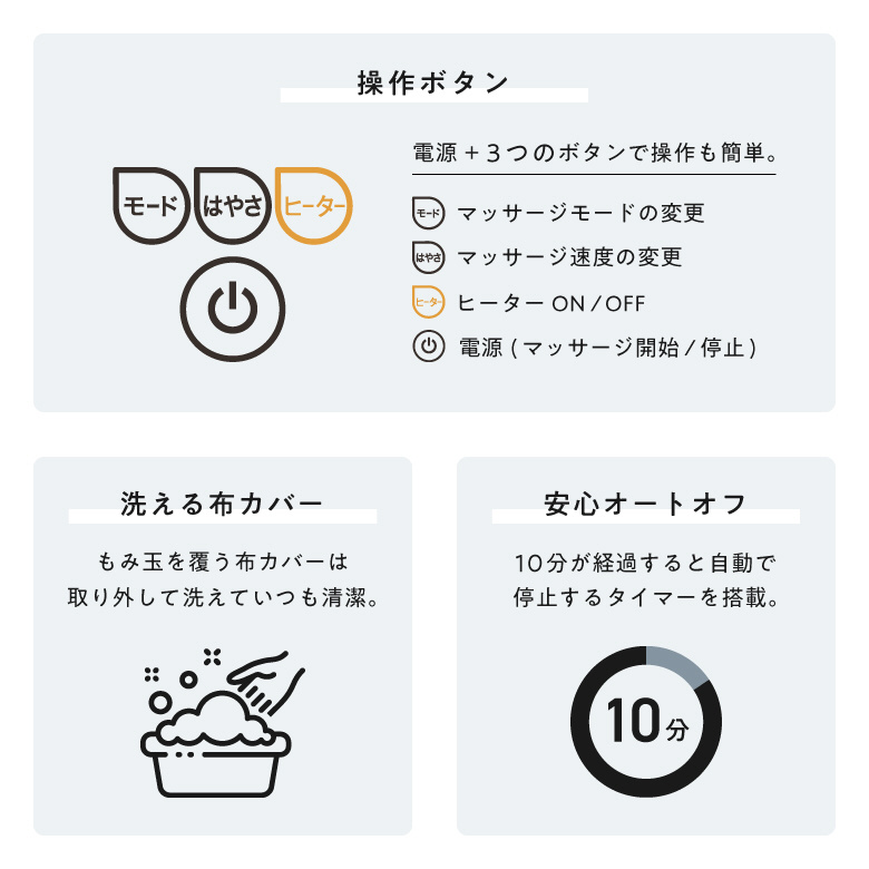| 使用可能部位 | 首、腰、太もも、ふくらはぎ、足裏 |