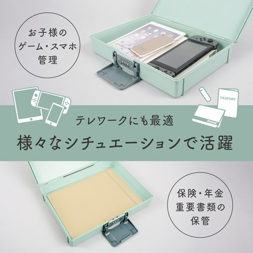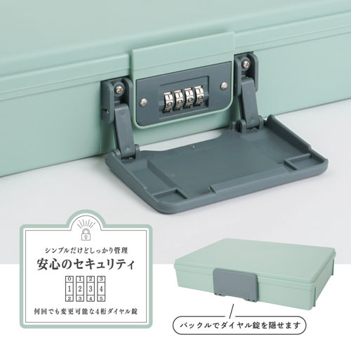 大切な書類などを保管。A4サイズや角2封筒もらくらく収納。変更できる4桁ダイヤル錠でしっかり管理。縦にも置けるから本棚にも収納出来て場所を選ばない。