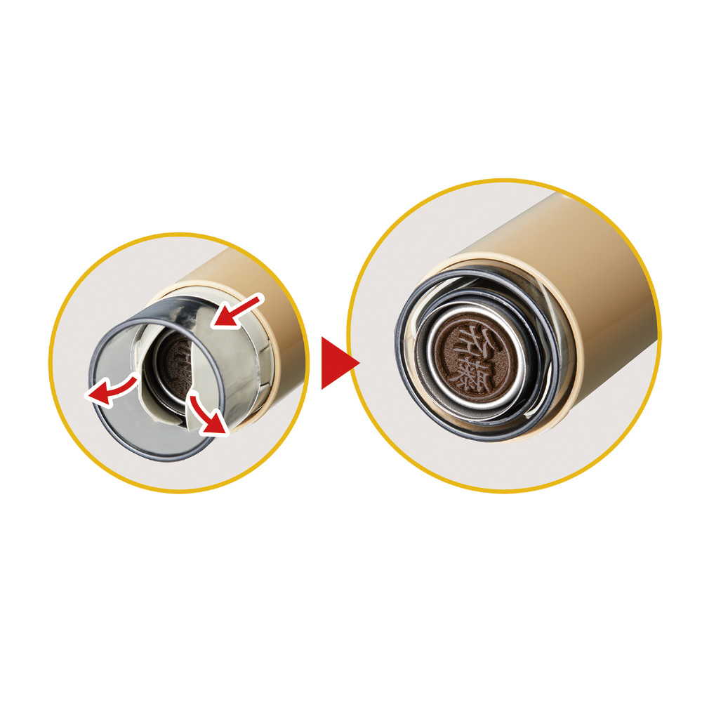 なつ印する時に印面先端のシャッターが自然に開閉するので、キャップを外す手間なくワンタッチでなつ印することができます。また、印面をロックすることができるので、安心して持ち運ぶことができ、立ち仕事や持ち歩きをしながら仕事をする職種の方にも最適です。