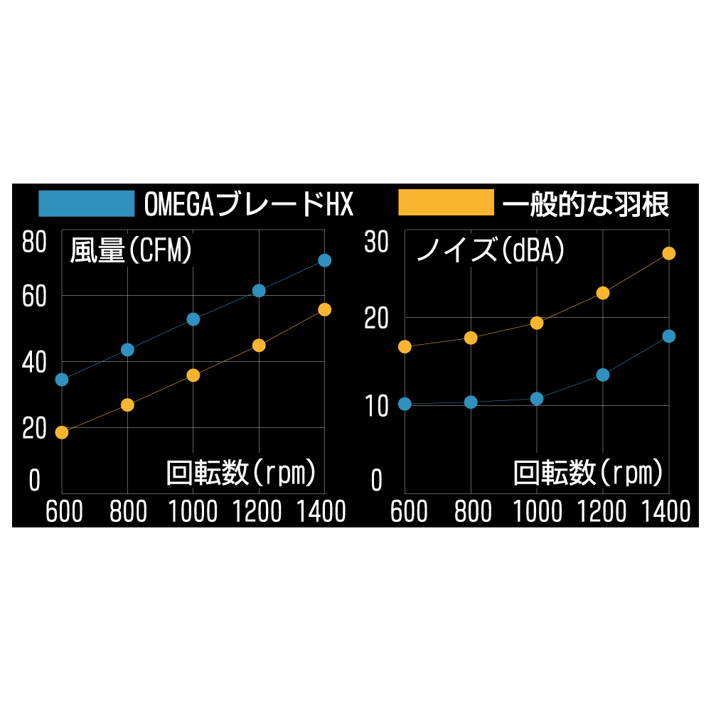 ■一般的な羽根のスリーブベアリングファンと比べ、約20%の風量増・約30%の騒音減を実現! (同等品ラインナップとの平均値から算出)