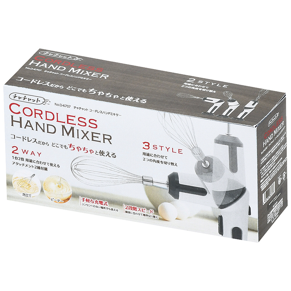 コードレスなので簡単手軽にチャチャっと使える、充電式コードレスハンドミキサー。コンセントのない場所で使えます。アタッチメントが2種類付属しているので、用途に合わせて使い分け1台で2WAYに使えます。