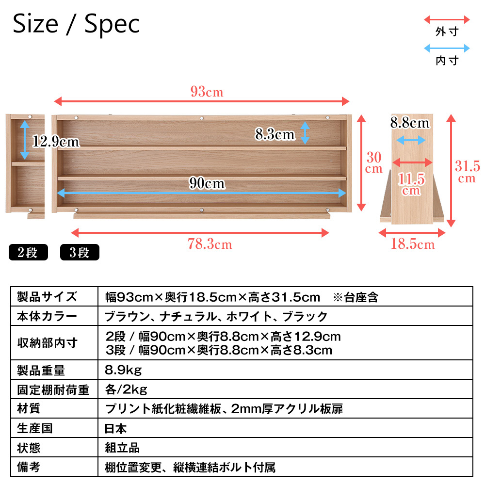 | 仕様1 | ・製品サイズ(約):幅93cm×奥行11.5cm×高さ31.5cm ※台座/幅78.3cm×奥行18.5cm ・収納部内寸(約):2段/幅90cm×奥行8.8cm×高さ12.9cm、3段/幅90cm×奥行8.8cm×高さ8.3cm ・製品重量(約):8.9kg ・耐荷重:各2kg ・材質:本体/プリント紙化粧繊維板、扉/2mm厚アクリル |