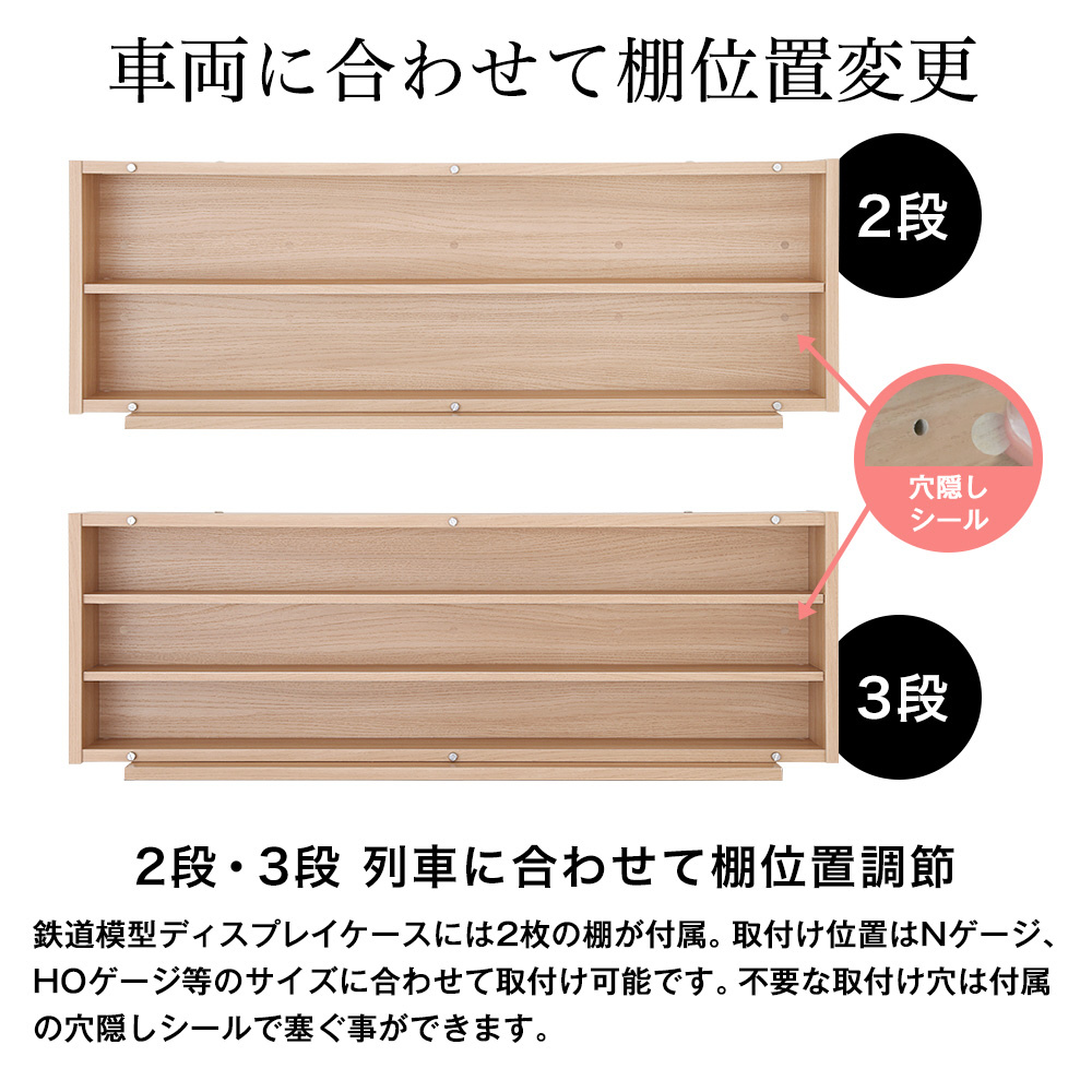 鉄道模型ディスプレイケースには2枚の棚が付属。取付け位置はNゲージ、HOゲージ等のサイズに合わせて取付け可能です。不要な取付け穴は付属の穴隠しシールで塞ぐ事ができます。