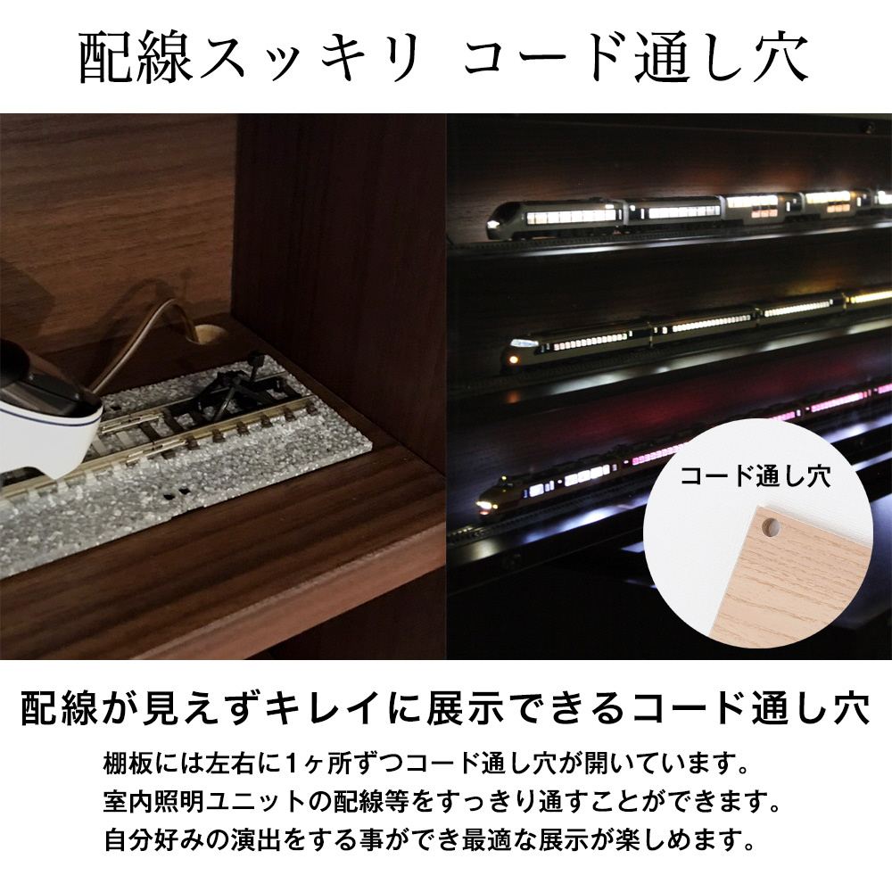棚板には左右に1ヶ所ずつコード通し穴が開いています。室内照明ユニットの配線等をすっきり通すことができます。自分好みの演出をする事ができ最適な展示が楽しめます。