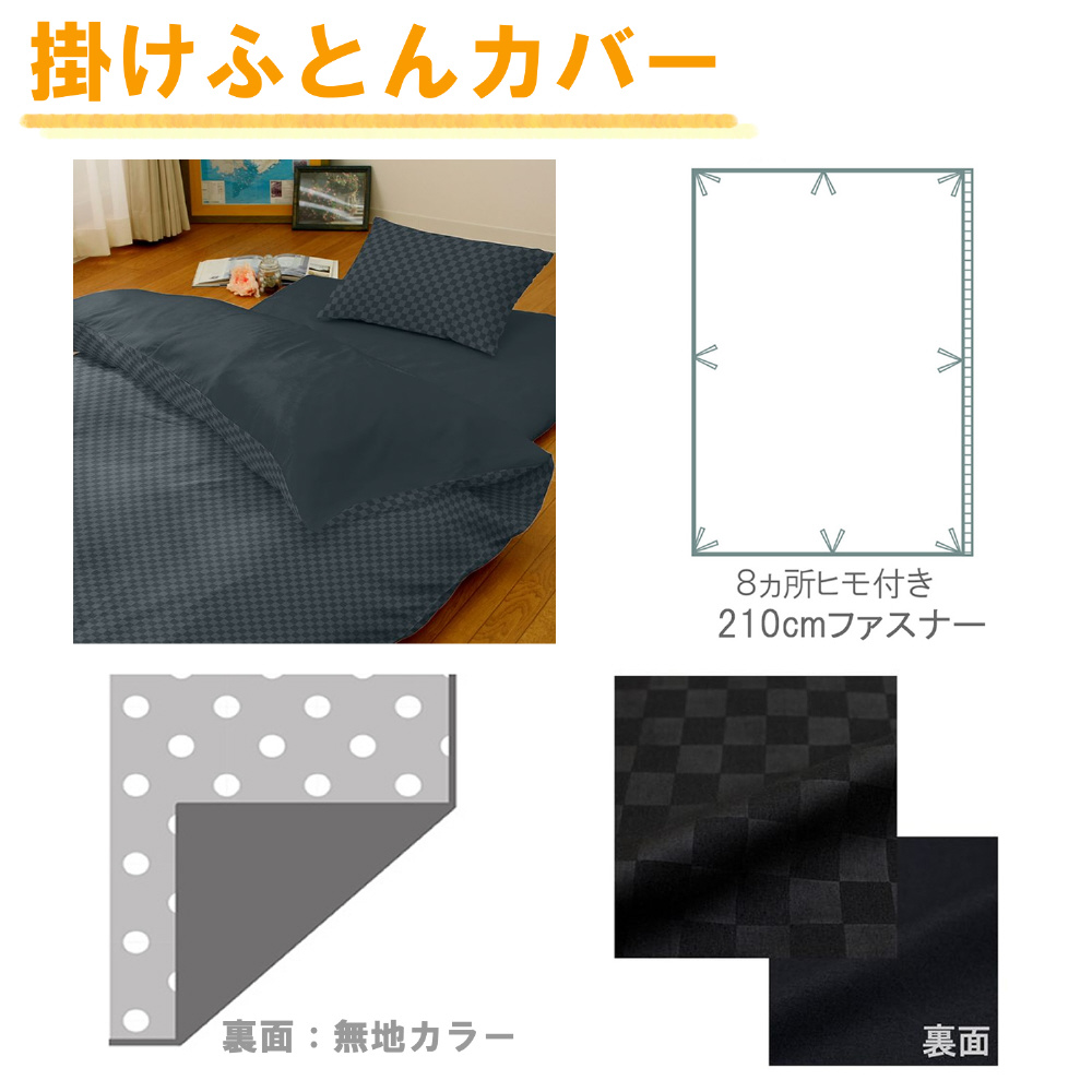 素材:ポリエステル100% 掛ふとんカバー(150×210cm 表:市松柄 裏:無地 YKK210mファスナー使用 8ヶ所ヒモ付き) 敷ふとんカバー(105×215cm 両面:無地 YKK210mファスナー使用) 枕カバー(43cm×63cm 両面:市松柄 あわせ式)