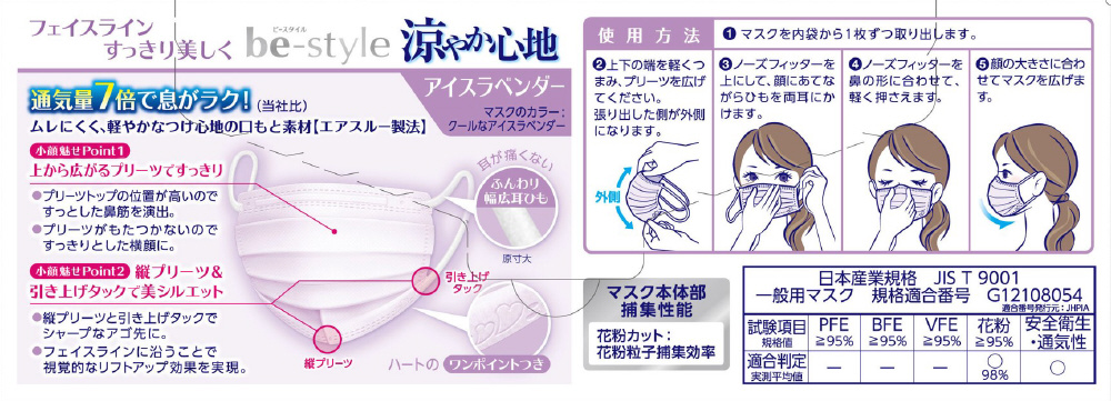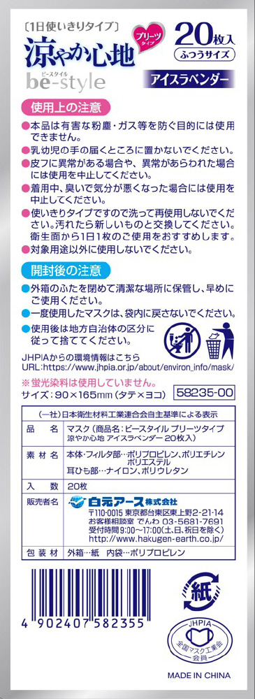 ●材質:≪本体・フィルタ部≫ポリプロピレン、ポリエチレン、ポリエステル≪耳ひも部≫ナイロン、ポリウレタン※蛍光染料は使用していません。
