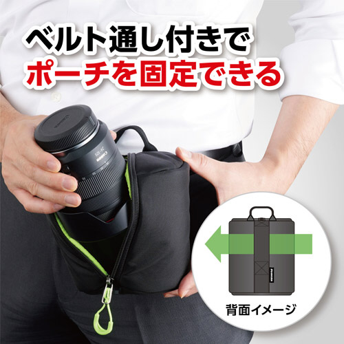 ポーチ背面のベルト通しにベルトを通して持ち運ぶことも可能。レンズを取り出しやすいお好みの位置に固定して使用できます。