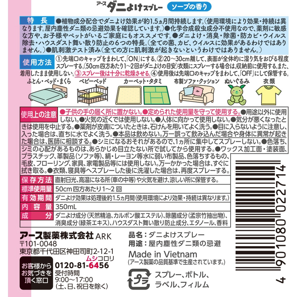 | 商品名 | アースダニよけスプレー ソープの香り 350mL 【864】 |