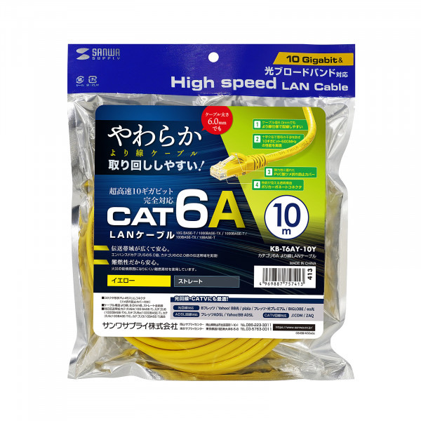 | 商品名 | LANケーブル PoE対応 イエロー KB-T6AY-10Y [10m /カテゴリー6A /スタンダード] |