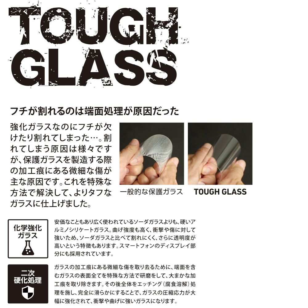 「TOUGH GLASS 3D」で使われている二次硬化ガラスは、一般的な熱強化処理を行った後に、特殊な薬品を使った硬化処理を行っています。2度の硬化処理により、側面・端面を含む全方位の硬化を実現。さらにガラスの強度自体も大きく向上。一般的なガラスでありながら、二次硬化処理により本来の強度よりも高強度になっています。表面処理として多層コーティングも施されており、指の滑りも快適に操作できるだけでなく、汚れにも強く皮脂や化粧品などが付着しても、軽く拭き取ることが可能です。
