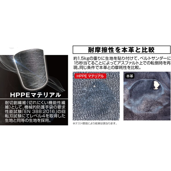ウエア生地内側はストレッチ素材を採用。外側には摩耗に強い特殊生地「HPPEマテリアル」を採用。