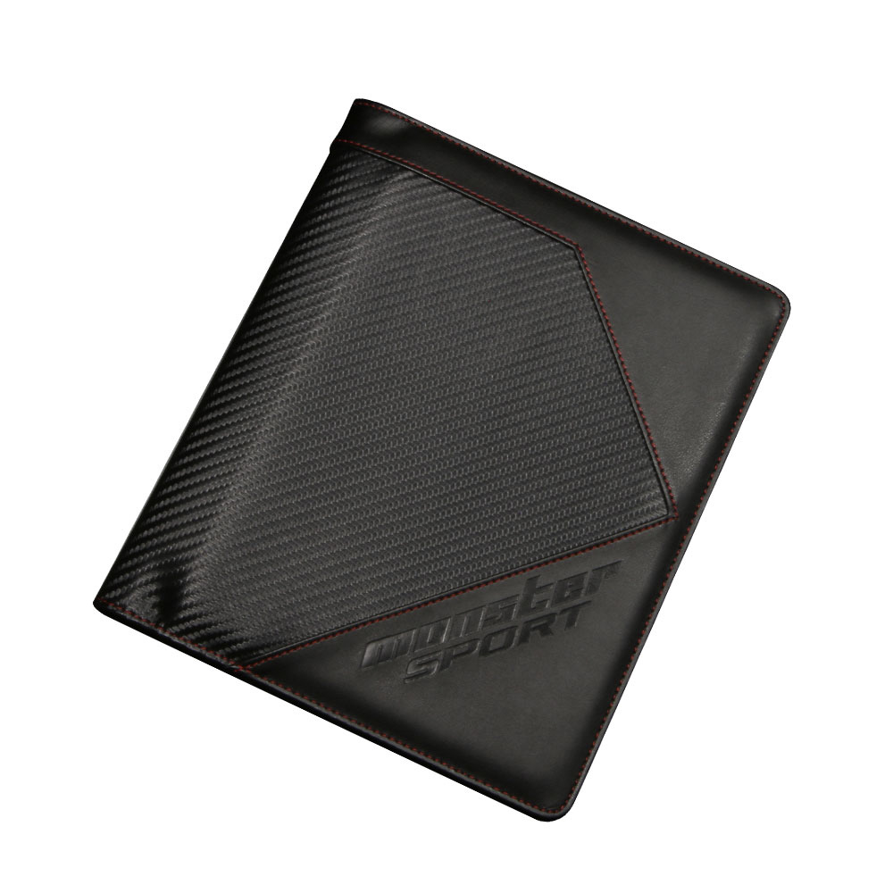 カーボン調×レッドステッチをあしらった、スポーツマインド溢れるデザイン。機能と質感に拘った、MONSTER SPORTオリジナル車検証ケース。大容量ポケットの採用により、車検証はもちろん、厚みのある車載書類もスマートに収納可能。