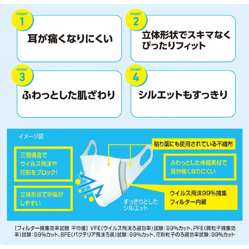 [フィルター捕集効率試験 平均値] VFE(ウイルス飛沫ろ過効率)試験:99%カット、PFE(微粒子捕集効率)試験:99%カット、BFE(バクテリア飛沫ろ過)試験:99%カット、花粉粒子のろ過効率試験:99%カット