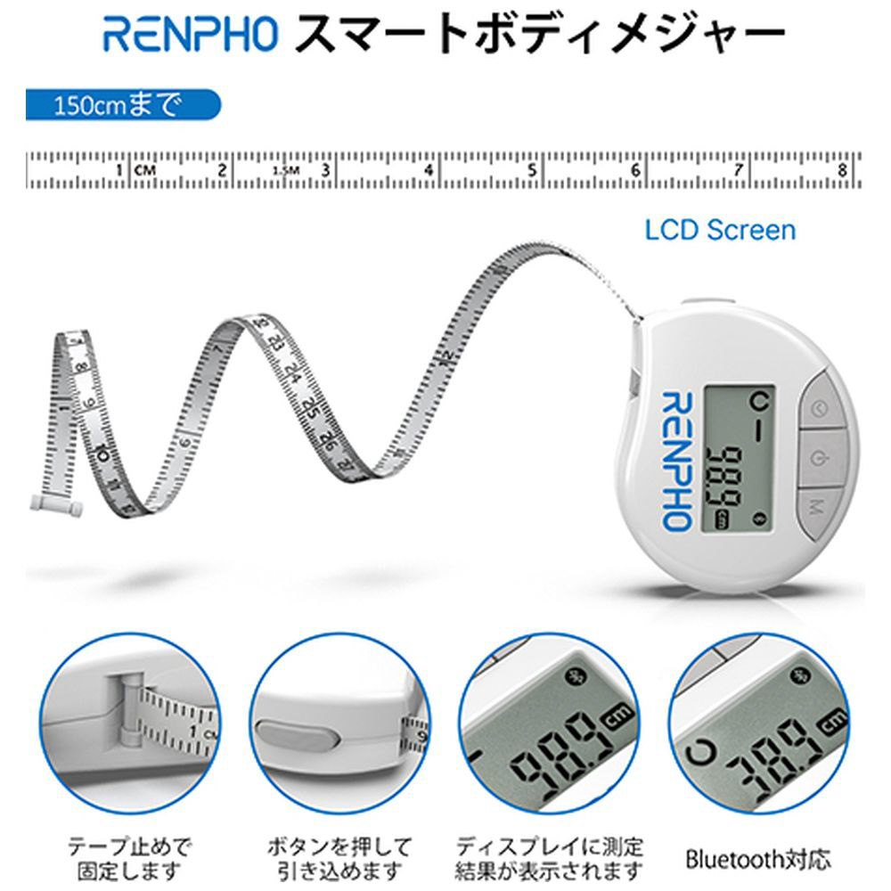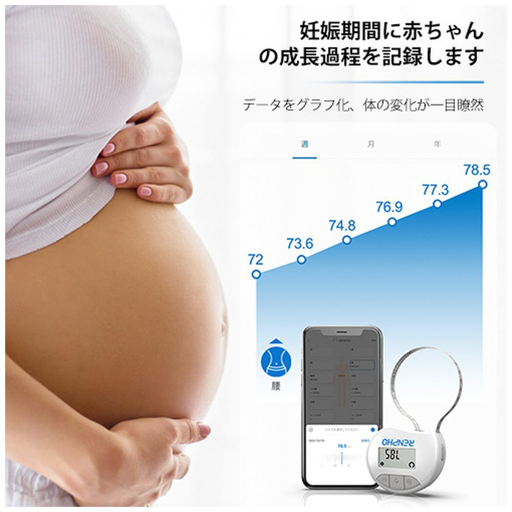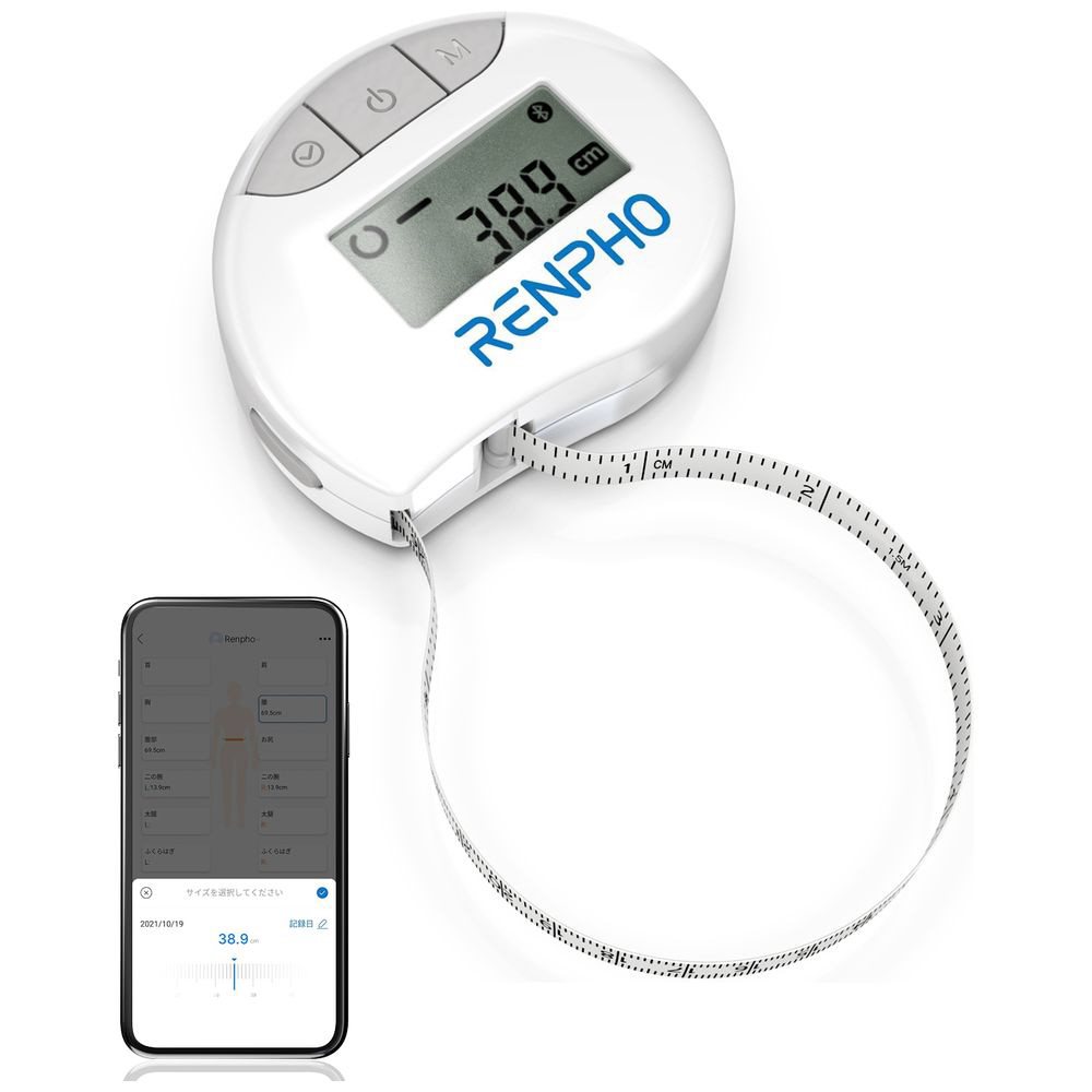RENPHOスマートメジャーは革新技術を採用しており、スマホと連携し、ウエスト、ヒップなど気になる部位を選択して専用アプリで一括管理 できます。