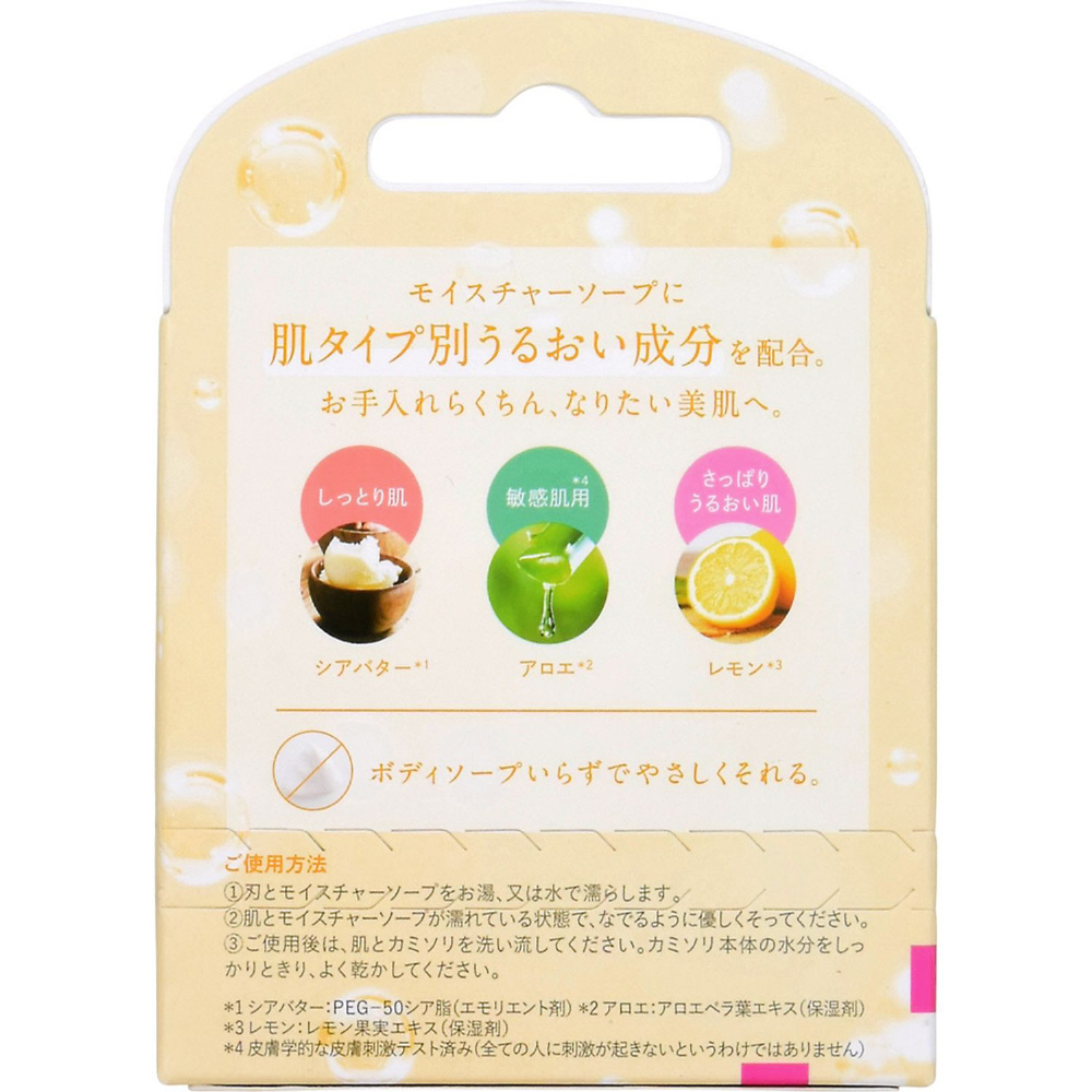 はじめてでも安心。ボディソープなしで剃れる。オーガニック素材を用いたナチュラルソープ付き刃。セーフティーワイヤー付き4枚刃。