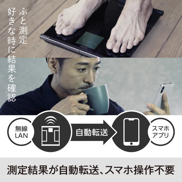 無線LAN通信なので、忙しいときでも簡単に計測、隙間時間にスマホアプリで測定結果を確認できます(BLE通信も可能)。