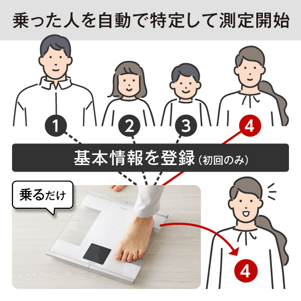 | 仕様2 | ・計量範囲:0〜180kg ・最小表示:50g(0〜100kg)/100g(100〜180kg) ・通信機能:Bluetooth Low Energy technology/無線LAN(IEEE802.11b/g/n) |