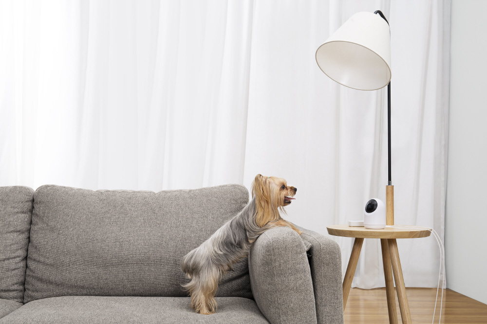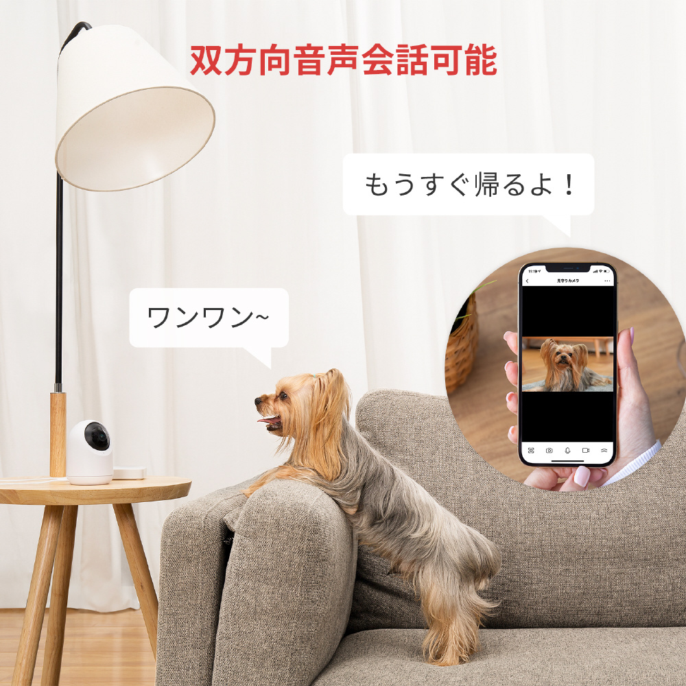 家で留守番しているワンちゃんが何をしているのか気になったら、外出先から見守りカメラを通じてコミュニケーションがで
