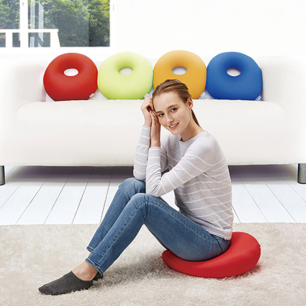 穴の位置をズラし、更に厚みに変化をつけることで、より腰やおしりに優しくフィット。イスにもソファにもちょうどいい!こだわりの大きさとフォルム。