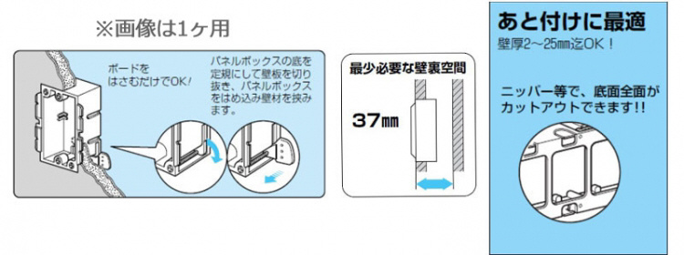間仕切り壁など、木ネジの効かない石膏ボード、木板へのスイッチボックスあと付けに最適