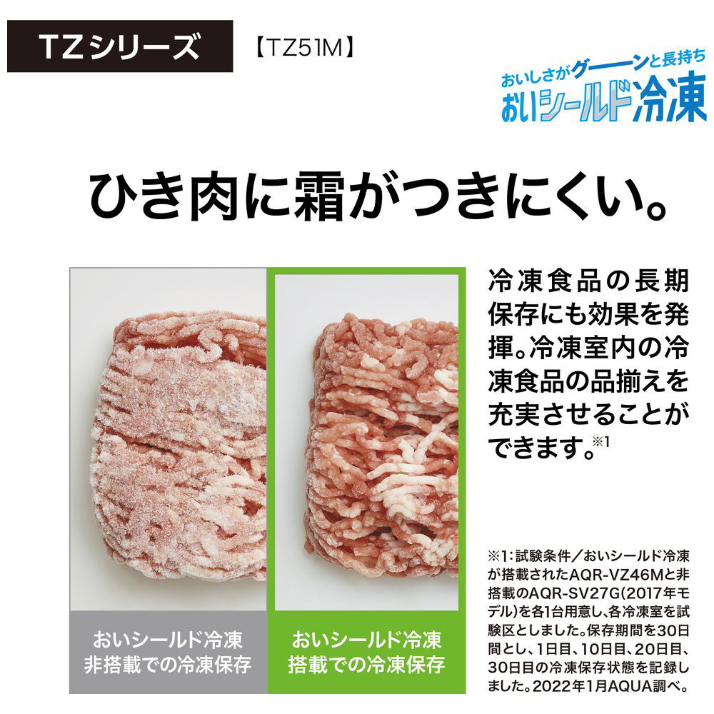 ※1:試験条件/おいシールド冷凍が搭載されたAQR-VZ46Mと非搭載のAQR-SV27G(2017年モデル)を各1台用意し、各冷凍室を試験区としました。保存期間を30日間とし、1日目、10日目、20日目、30日目の冷凍保存状態を記録しました。2022年1月AQUA調べ。