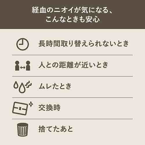 ●活性炭消臭シート(消臭材) で経血のニオイまで消臭。交換時、捨てたあとも、ニオイ気にならない。