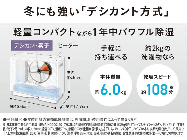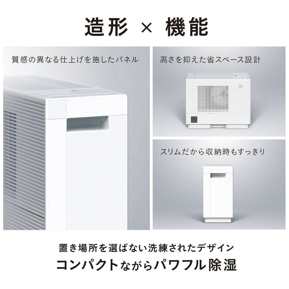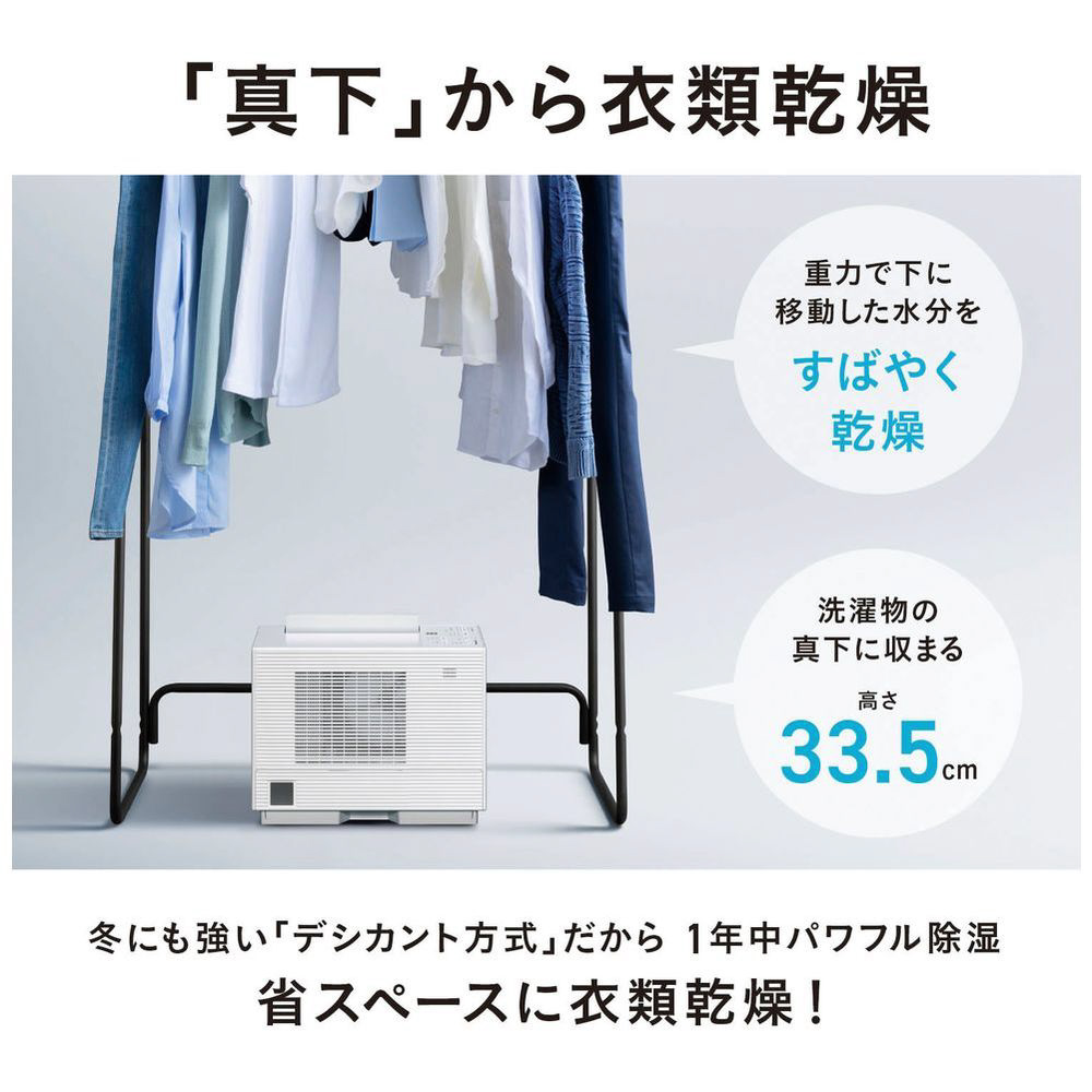デシカント式なので気温が低い時でもパワフルに除湿。洗濯物を真下から乾かせる高さを抑えた低背デザイン。ナノイーXで衣類を脱臭・除菌。軽量かつコンパクトで移動もしやすい衣類乾燥に特化した除湿機。