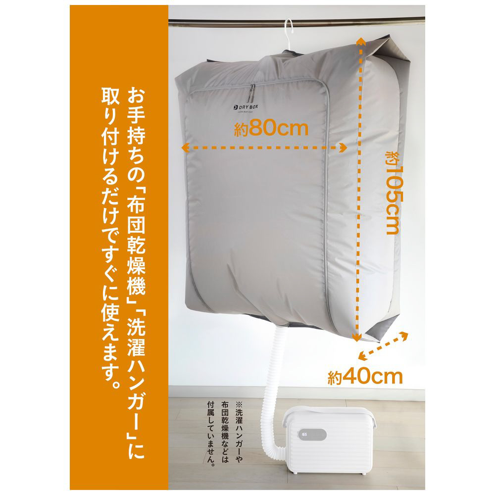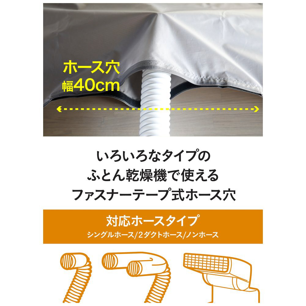ホース穴は様々な形のホースに対応できるファスナーテープ仕様なので、お手持ちのふとん乾燥機ですぐに使えます。