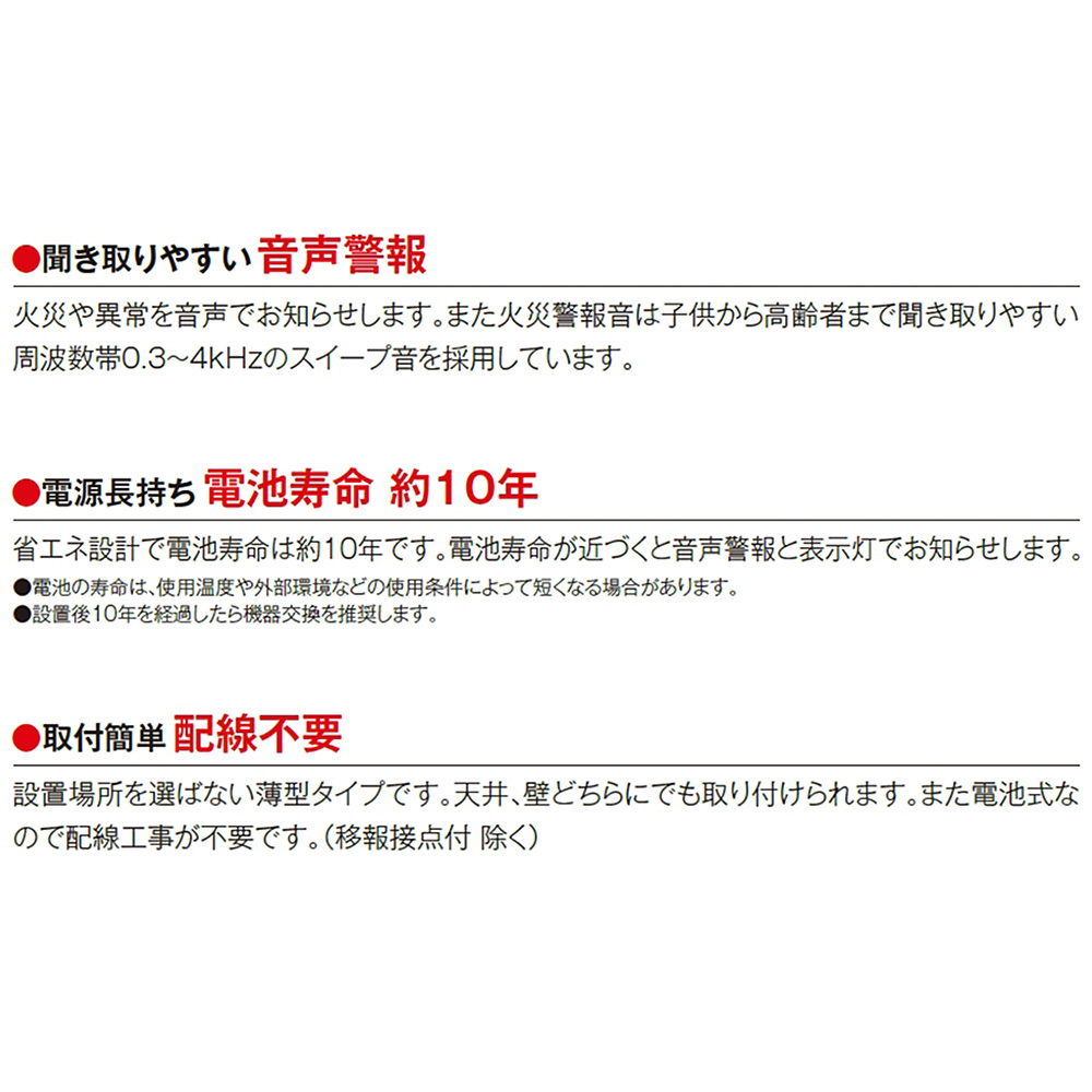 省エネ設計で電池寿命は約10年です。電池寿命が近づくと音声警報と表示灯でお知らせします。