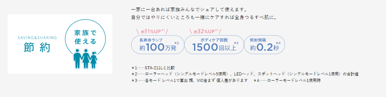 | 照射回数 | 約100万発 ※ローラーヘッド(シングルモードレベル5使用時)、LEDヘッド、スポットヘッド(シングルモードレベル1使用)の合計値 |