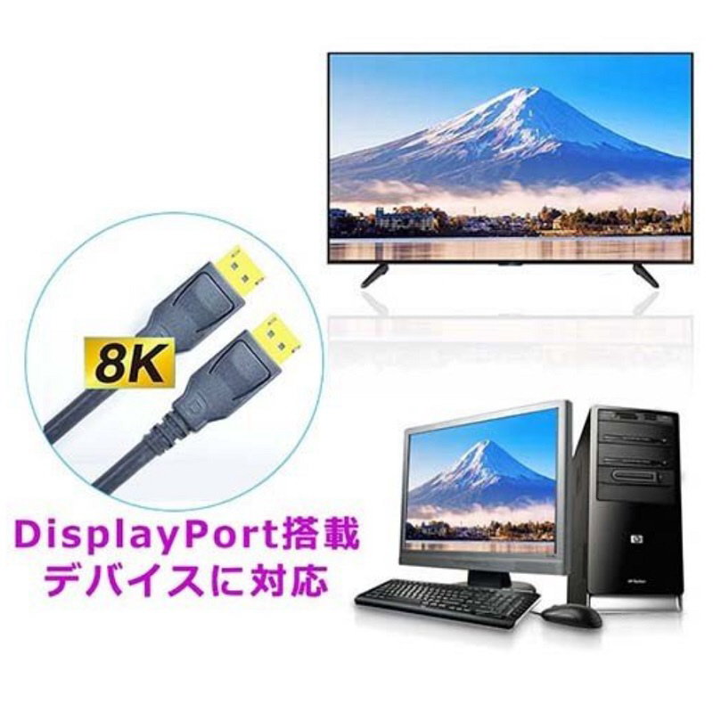 DisplayPort端子搭載のパソコンなどと、ディスプレイ、モニターなどを接続し、映像と音声信号を伝送できるDisplayPortケーブルです。