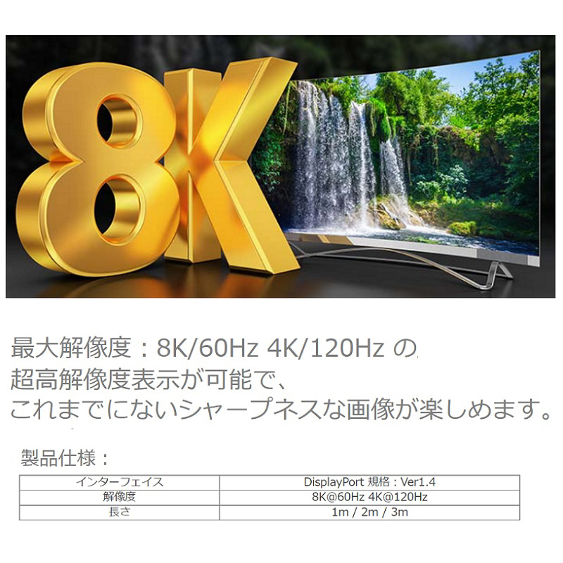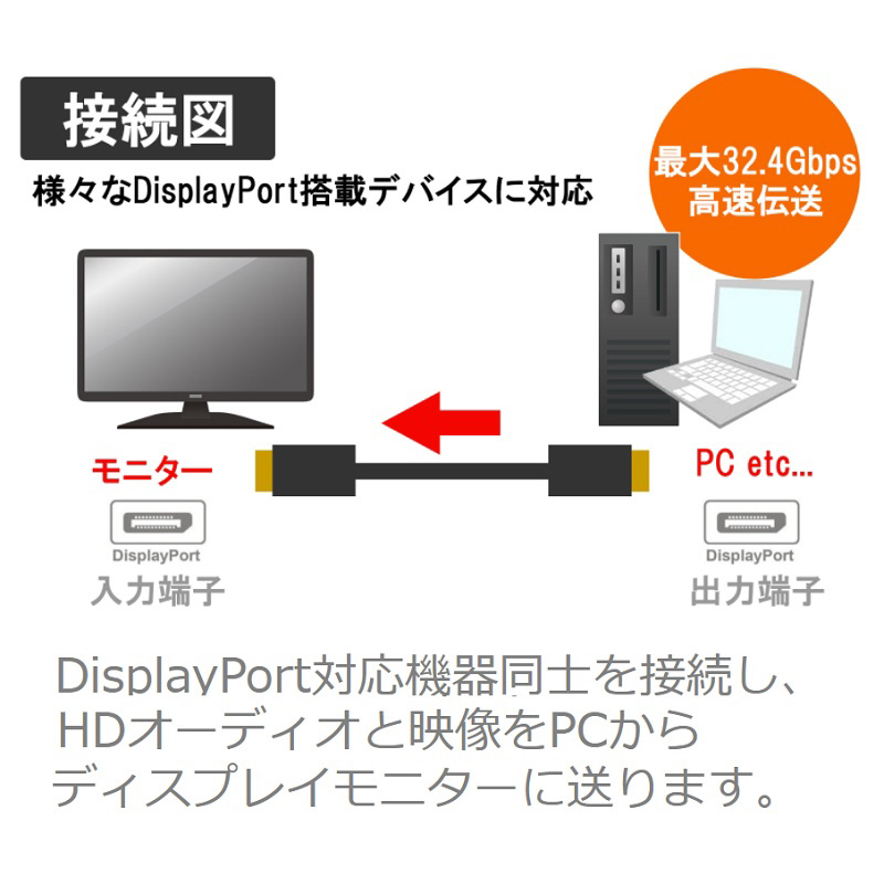DisplayPort端子搭載のパソコンなどと、ディスプレイ、モニターなどを接続し、映像と音声信号を伝送できるDisplayPortケーブルです。