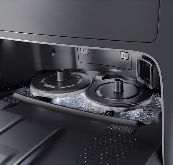 汚れたモップはステーション内で自動洗浄。綺麗な水ですすぎ、熱風と高速回転で快速&静音乾燥。嫌な臭いも一切残りません。