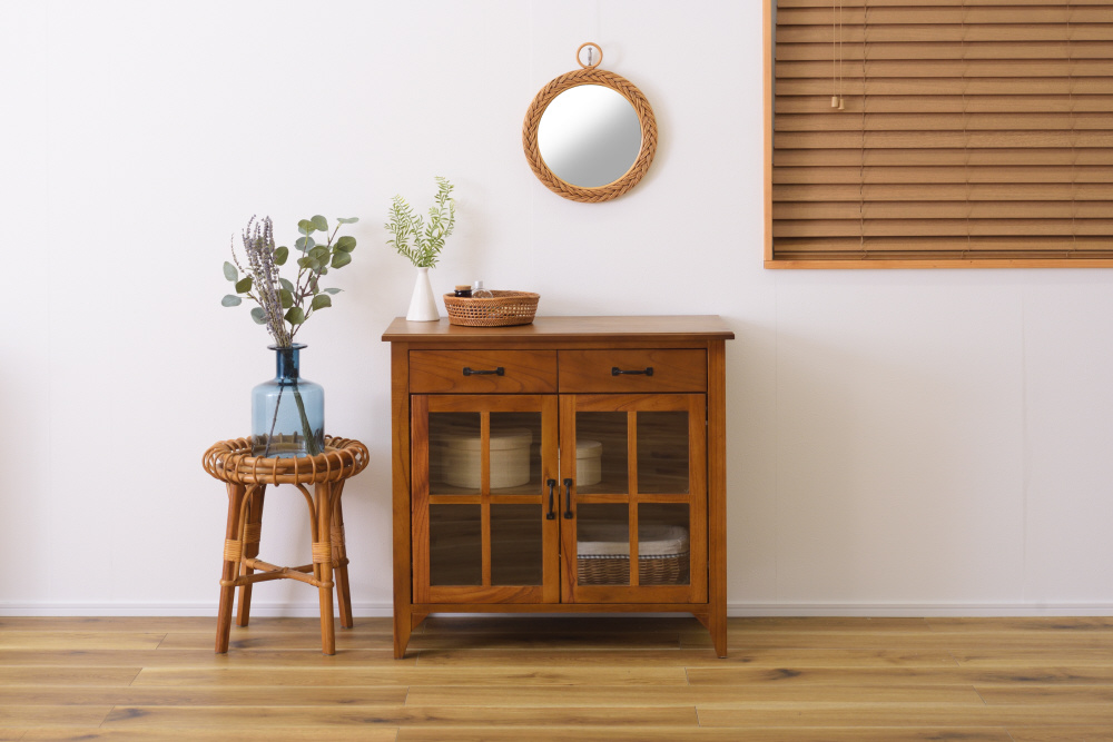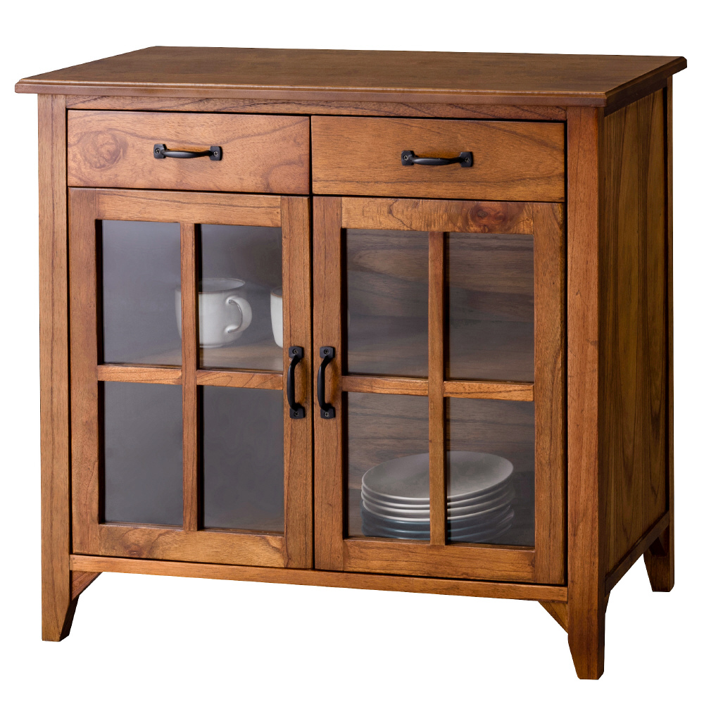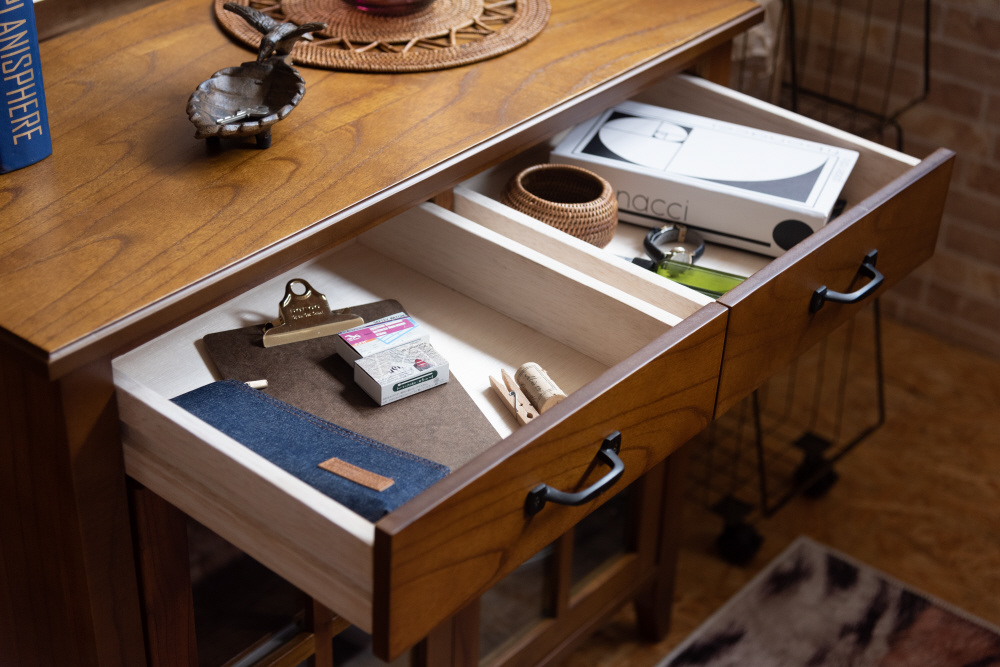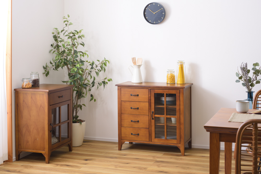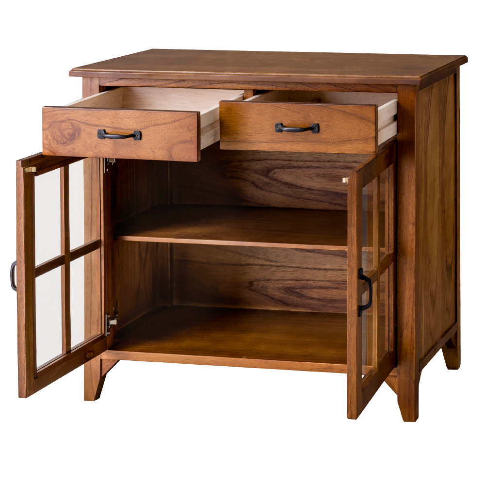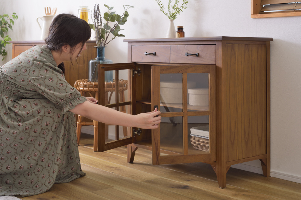 上段に引き出し2杯、下段に両開きタイプのガラス扉が付いたバランスの良いキャビネット。上段の引き出しには書類などの収納に最適。下段のガラス扉収納スペースは、インテリア性の高い小物を入れて「見せる収納」にピッタリ。また、センターフレームのない収納スペースなので自由に小物を収納することができます(中棚は固定タイプです)。脚裏にはフェルトが付いているので、床への傷防止になり安心です。