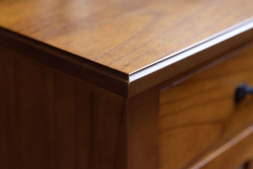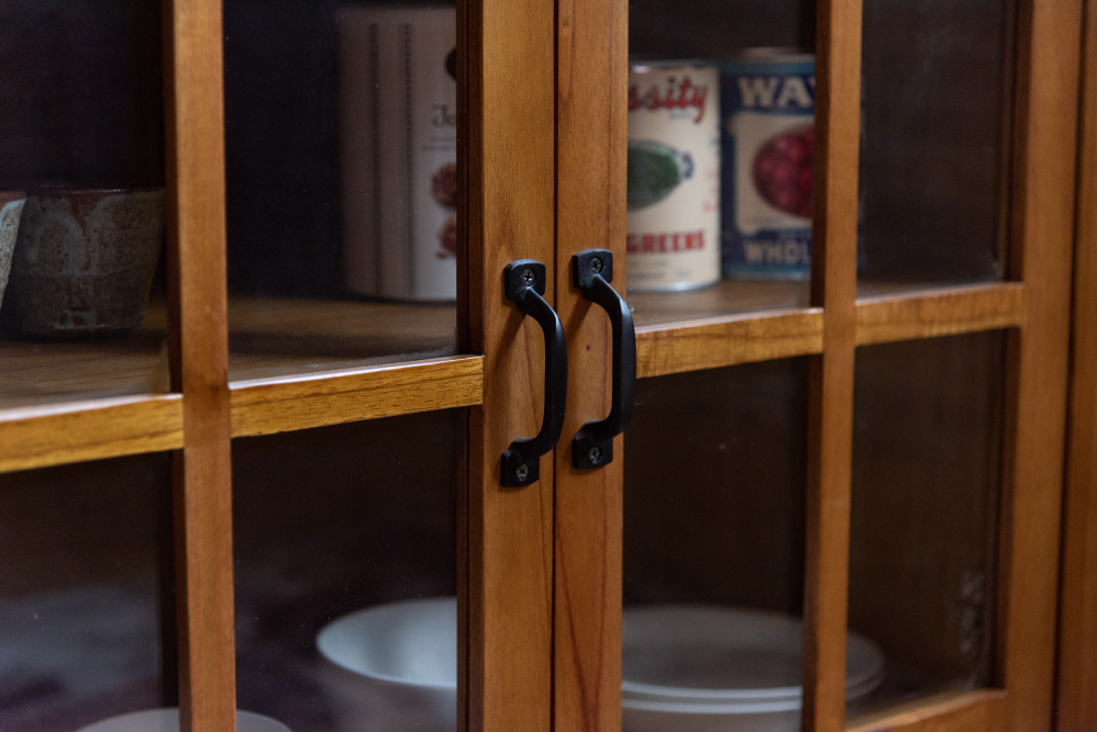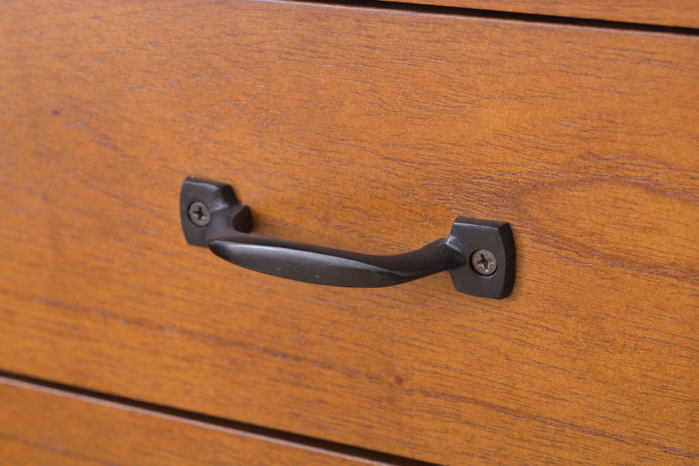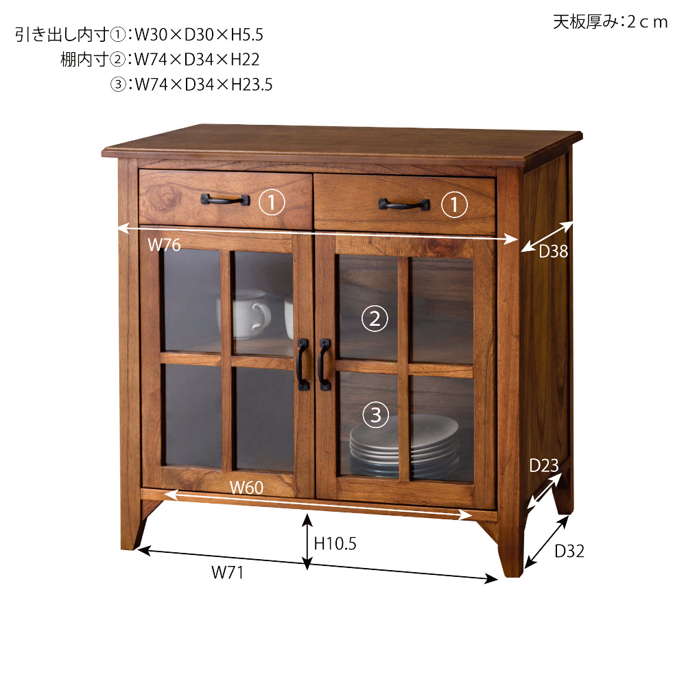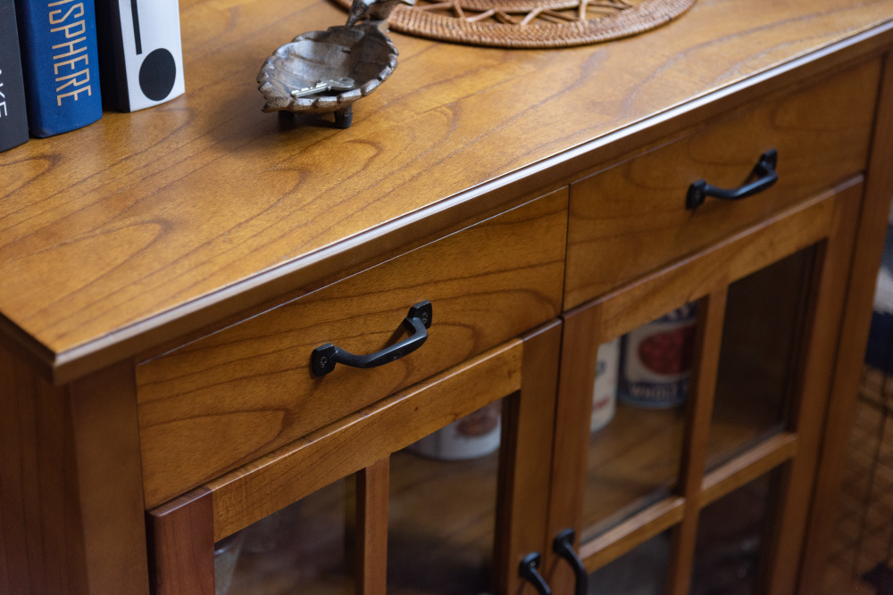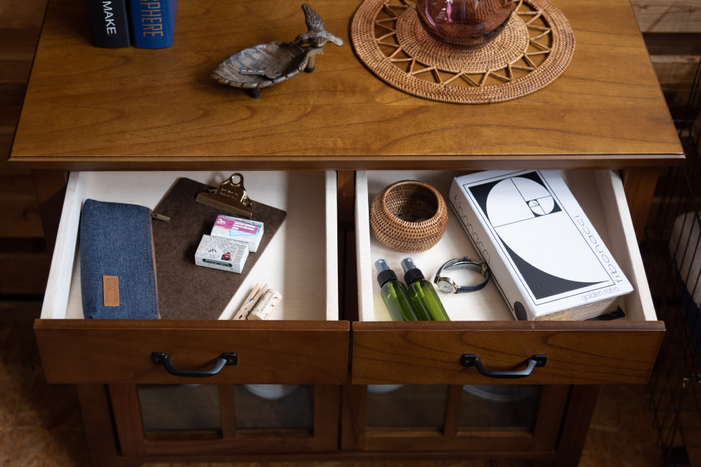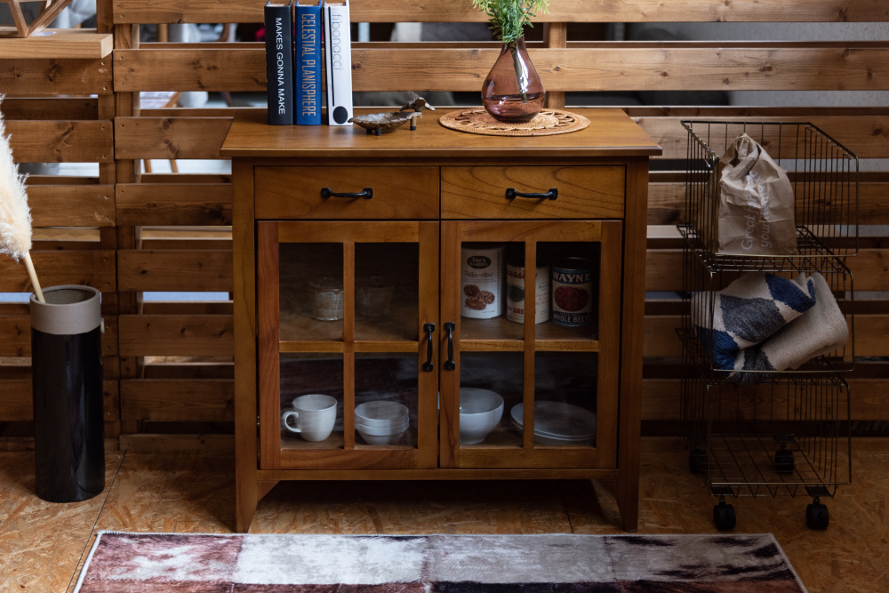 上段に引き出し2杯、下段に両開きタイプのガラス扉が付いたバランスの良いキャビネット。上段の引き出しには書類などの収納に最適。下段のガラス扉収納スペースは、インテリア性の高い小物を入れて「見せる収納」にピッタリ。また、センターフレームのない収納スペースなので自由に小物を収納することができます(中棚は固定タイプです)。脚裏にはフェルトが付いているので、床への傷防止になり安心です。