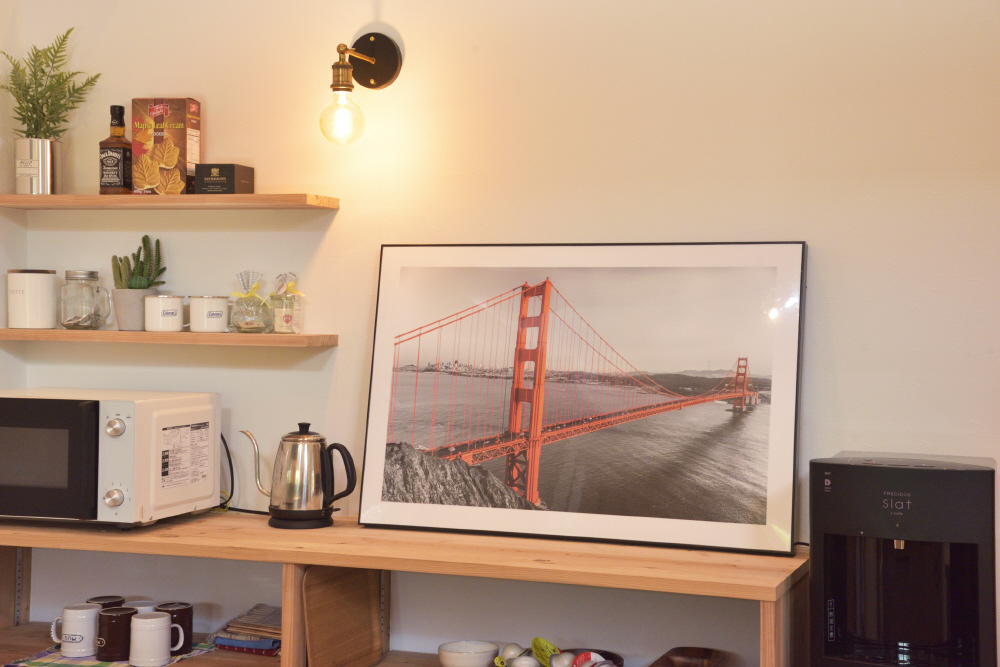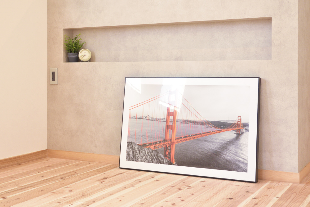 売れ筋サイズで厚みがあり、表面加工も光沢を帯びており高級感があります。壁に掛けたり、立てかけるだけでリビング、廊下、ベッドルームなど様々な空間を簡単におしゃれな雰囲気に作ることができます。開店祝いなどのギフトとしてもおススメです。パネル裏面の2箇所に三角吊りカンが付いているので、三角吊りカンに紐を通せば壁面への設置も簡単です(紐は付属されておりません)。