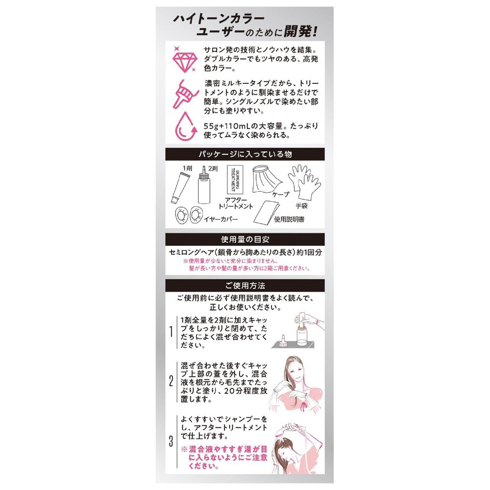 透明感・ツヤ感あるメタリック調のカラーを楽しめます。「got2bボンディング・ブリーチ」でも採用している「ボンディング・テクノロジー」搭載で切れにくいハイトーン髪*を楽しめます。