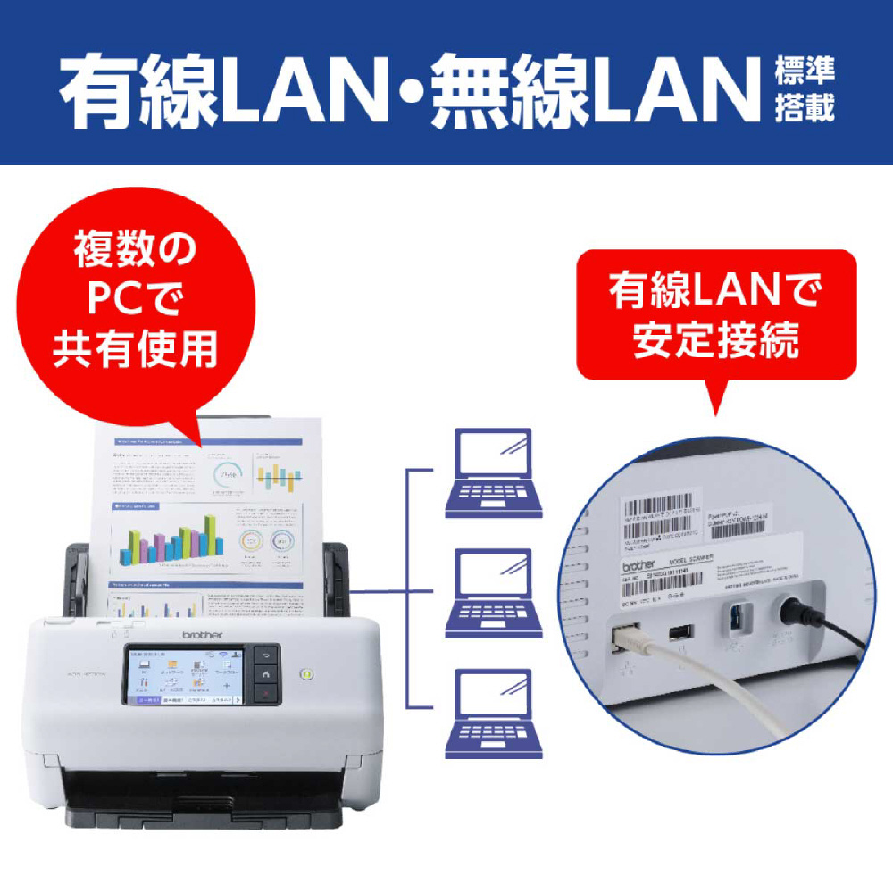有線・無線LANを標準搭載。ネットワーク上の複数のPCでスキャナーを共有して使用することができます。