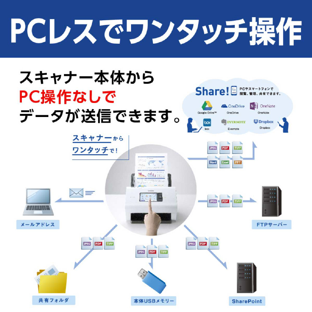 スキャナ―本体からPC操作なしで直接ネットワーク上の共有フォルダや、Eメールの添付ファイルとしてデータを送れるので、原稿をセットしたその場でスキャンジョブを完了できます。