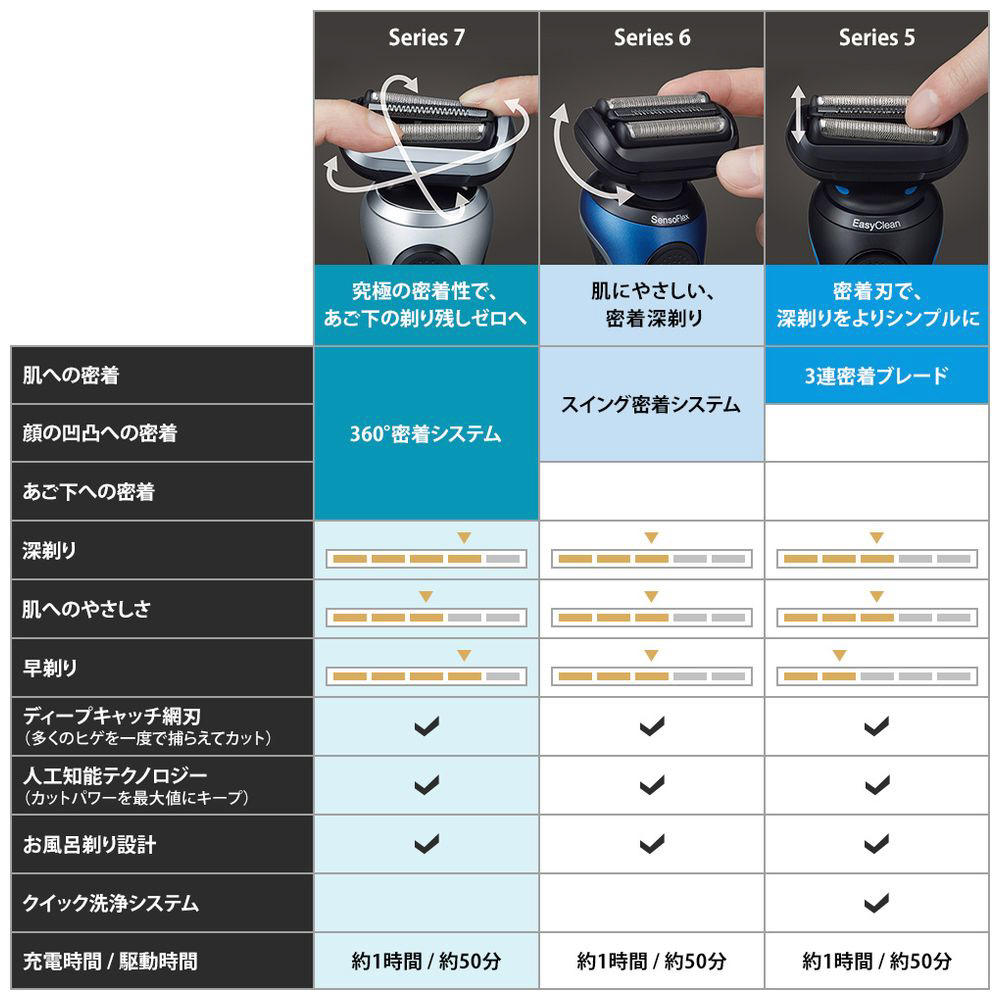 シリーズ7は360度密着システムで、あご下のような剃り残しやすい箇所でもしっかり密着して深剃り。新たに追加されたヒゲトリマーアタッチメントにより好みのスタイルに合わせてヒゲをトリミングすることが可能に。