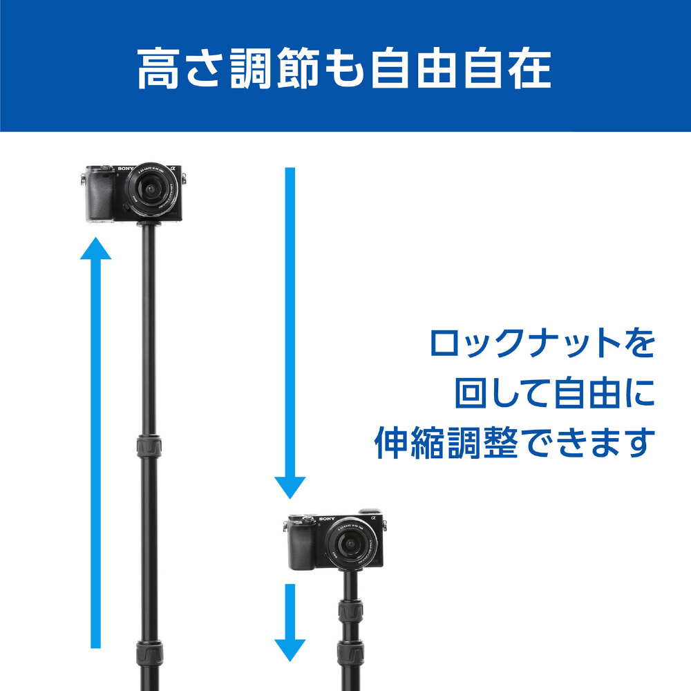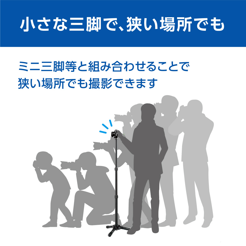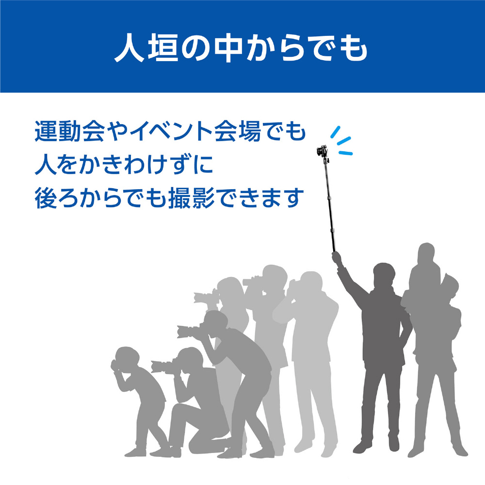 狭い場所や人垣の中からでも撮影の幅が広がります。下端の石突を取り外せば延長ポールとして使うこともできます。