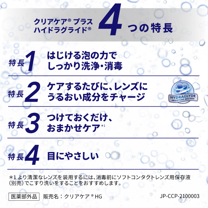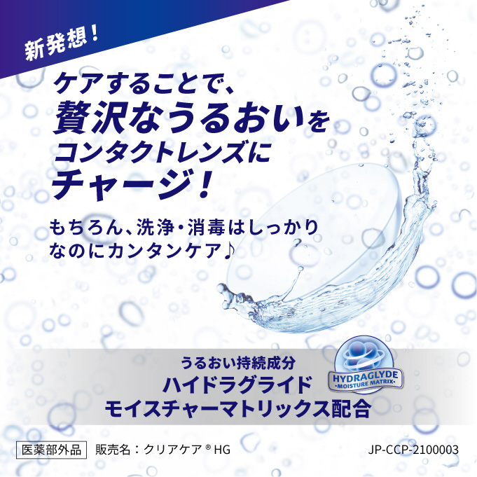 独自のうるおい持続成分ハイドラグライドモイスチャーマトリックスが、ケアするたびにコンタクトレンズの表面にうるおいベールを形成し、毎日、快適なつけ心地をサポート。