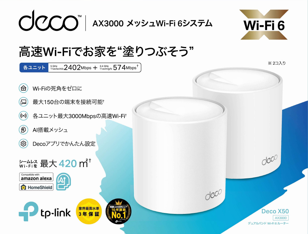 Wi-Fiルーター 2402+574Mbps Deco X50(2パック) DecoX502P [Wi-Fi 6(ax)]