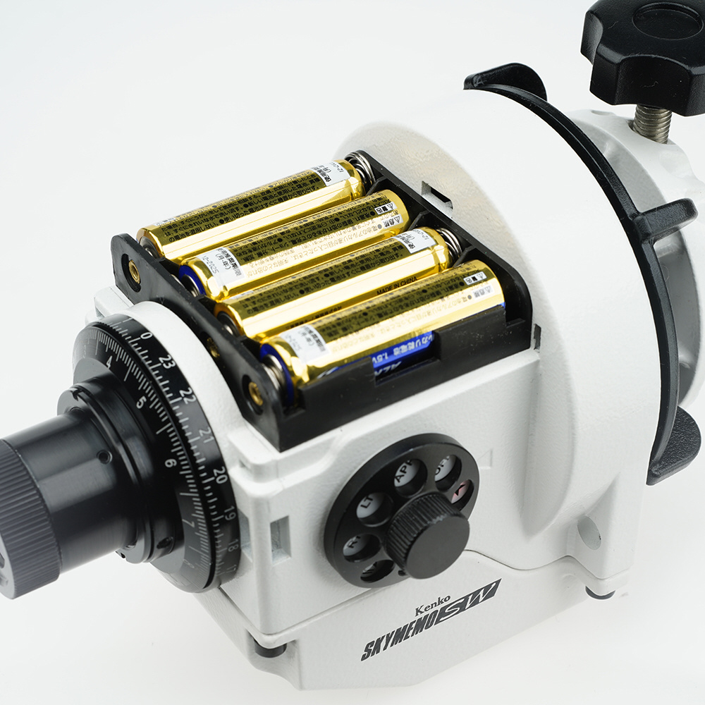 電源は、単3形アルカリ乾電池4本(別売)を使用。約36時間(設計値)の連続使用が可能。(気温20度、恒星時駆動、アルカリ乾電池)