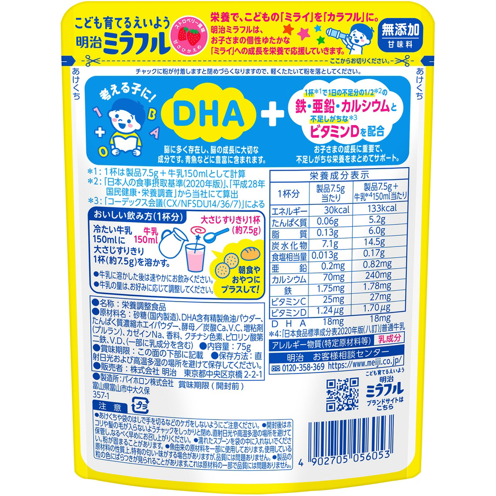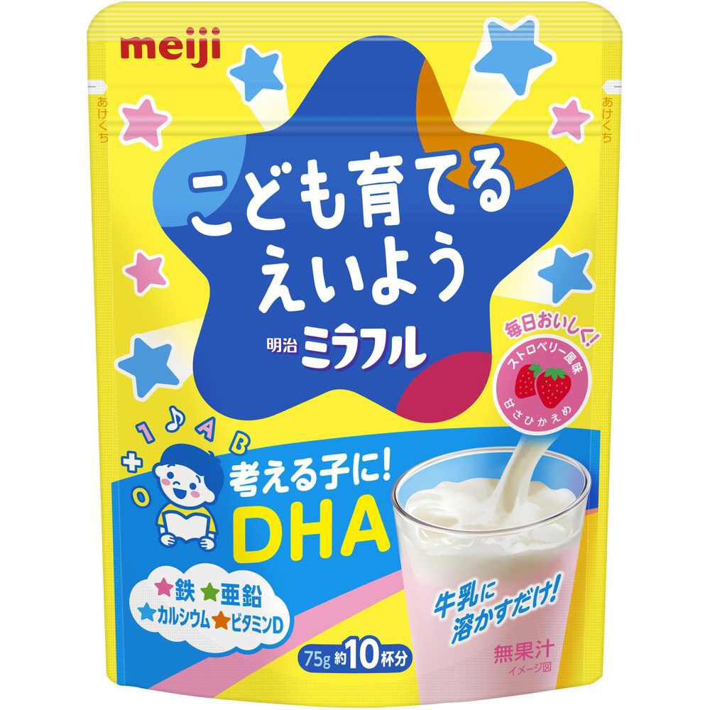 幼児期の成長に重要な栄養素(鉄・亜鉛・カルシウム・ビタミンD)と、幼児期のアタマにとても大切なDHAを配合した牛乳に溶かして飲む粉末飲料なので、おやつや食事の一品として手軽においしく飲むことで、お子さまのより良い成長をサポートすることができる「明治ミラフル 粉末飲料 ストロベリー風味」。