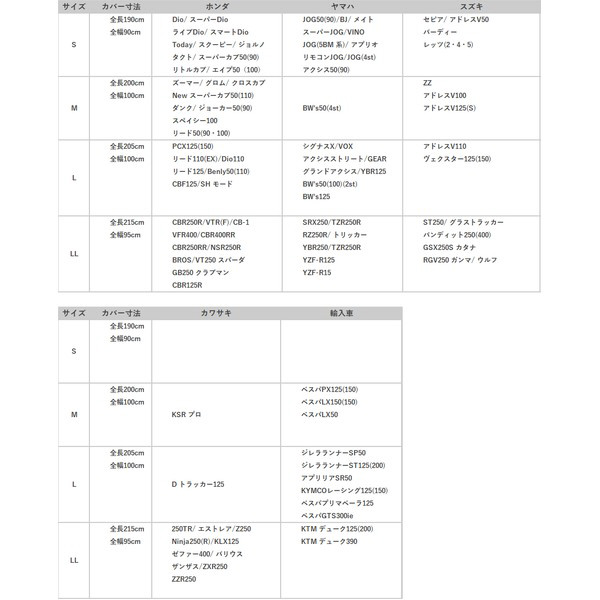 ●サイズ適応表は目安となります。適応表に車種がない場合や、お客様の好みの大きさ等はバイクカバー実寸法を参考ください。