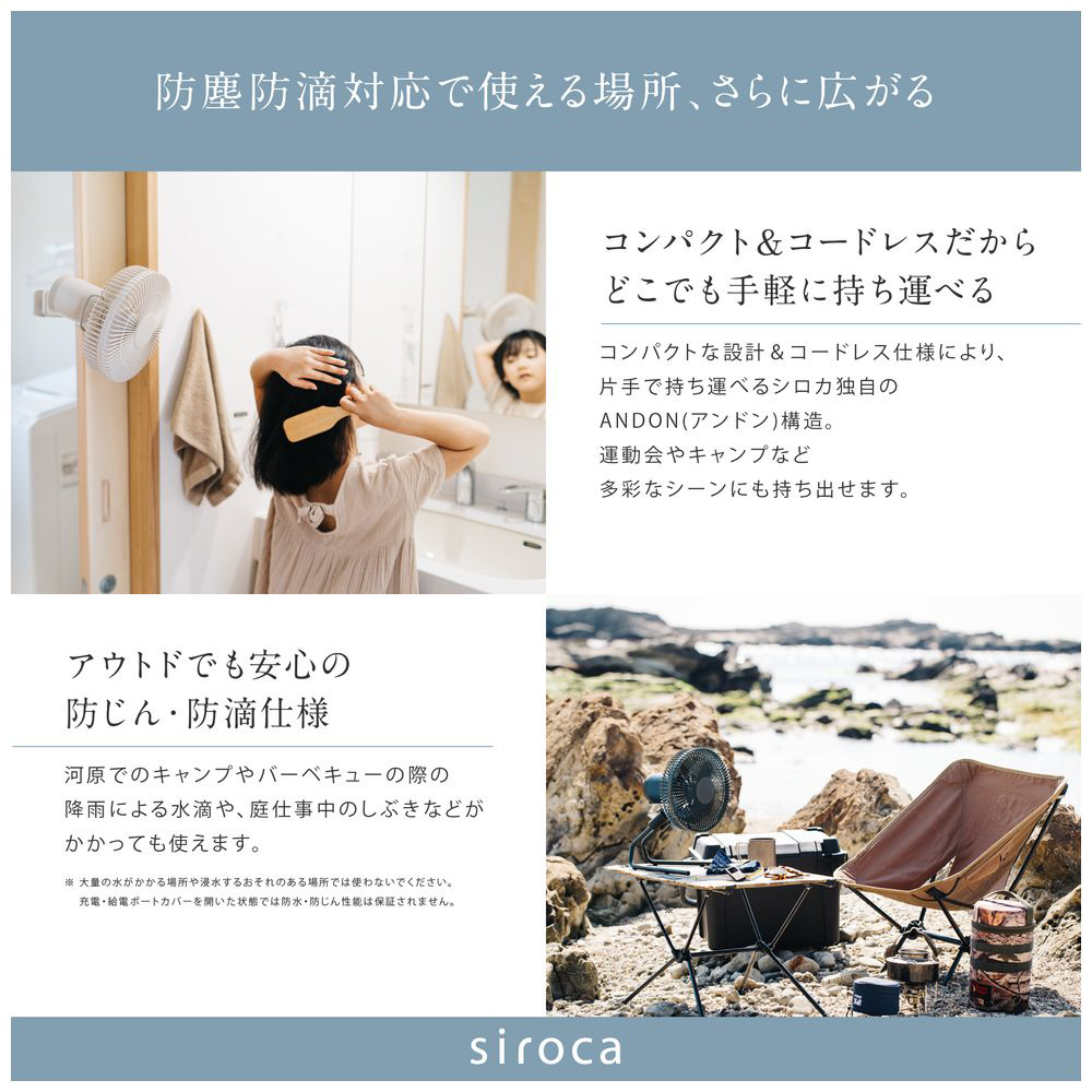アウトドアでも、暮らしの中でも快適な風をいつも身近に。コンパクト&コードレス、防じん・防滴で屋内も野外も。あらゆるシーンを快適に。